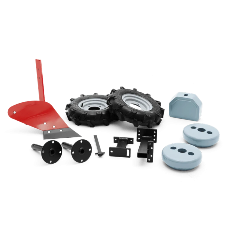 Complete ploeg en wielenset waarmee u over de aarde kunt rijden om rijen te maken en onkruid onder te spitten.