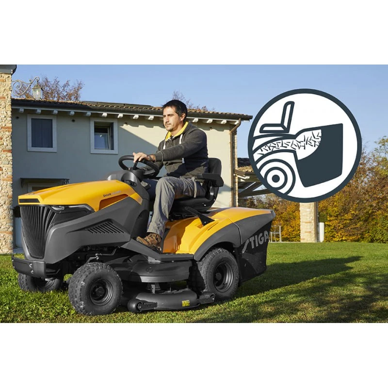 De achterwielen worden krachtig aangedreven door de nieuwe STIGA tweecilindermotor, die met een lagere temperatuur draait voor een langere levensduur. Het maaidek met een breedte van 98 cm verzekert snel en precies maaien.